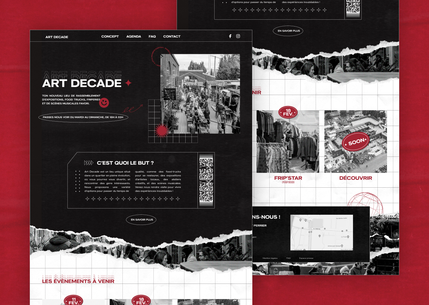 Pour capter l'esprit de ce lieu, nous avons opté pour un style underground et une inspiration urbaine, en intégrant l'idée d'un mur collaboratif où chacun peut afficher des posters pour exprimer son identité et sa culture. Ce concept mural ne sert pas seulement de décoration mais devient un symbole du partage et de la diversité culturelle d'Art Decade.