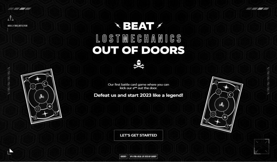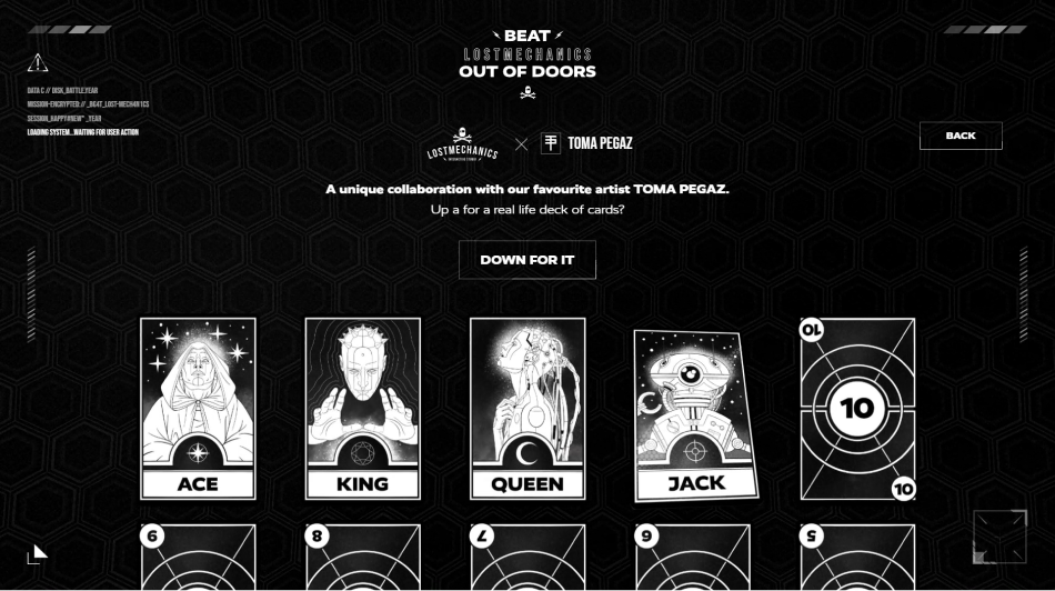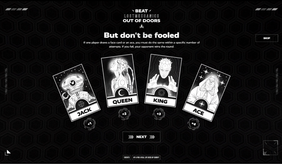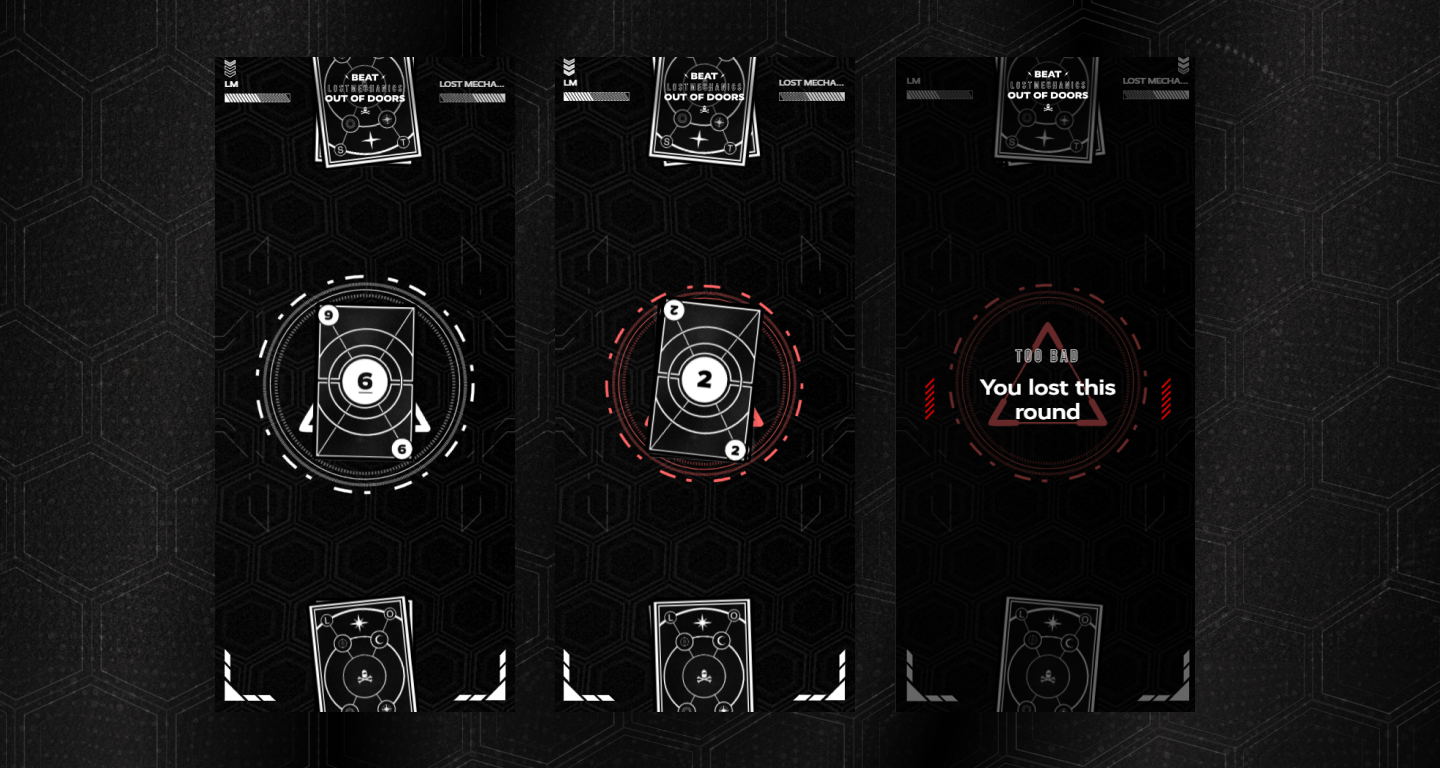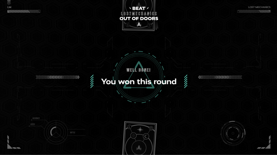 Inspiré par la bataille corse, Out of Doors permet aux utilisateurs d'améliorer leurs réflexes et de captiver leur attention à travers un jeu immersif où ils doivent battre l'équipe de Lost Mechanics dans une partie de cartes endiablée. Influencé par des thèmes post-apocalyptiques et cyberpunk, l'objectif était de créer une aventure épique où les joueurs affrontent une force redoutable menaçant le monde. Le jeu met à l'épreuve les réflexes et la concentration des joueurs dans une quête pour sauver l'humanité.